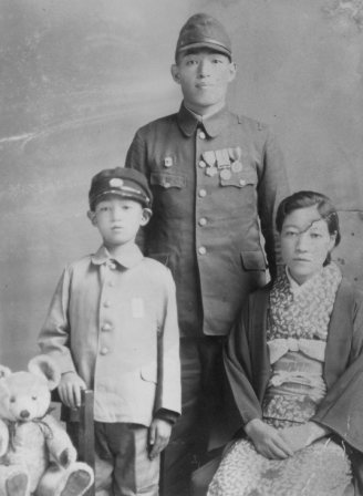 階級章がさかさまに取り付けられています。急な出征に慌ただしい時間が過ぎたのでしょう。緊張と云うか覚悟の表情が痛々しい一家。
