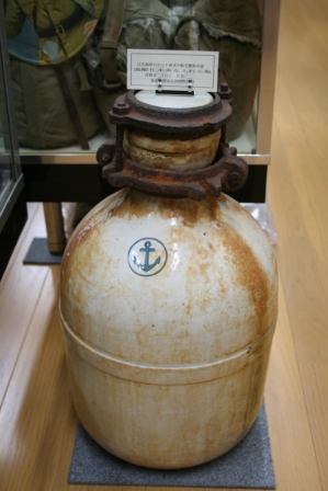 右は海軍ですが、なんと、三菱J8M1「秋水」ロケット戦闘機の燃料ケースです。腐食しやすいので陶器製。