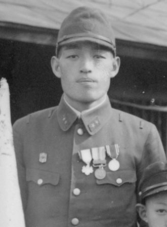 胸には勳八等、満州事変従軍記章、赤十字章、在郷軍人記章が輝き、襟には上等兵の階級章も。でも急な応集であわてたのでしょうか?
